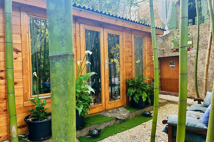 Un abri de jardin isolé en guise de spa en bambou hors du commun à Anduze dans le Gard